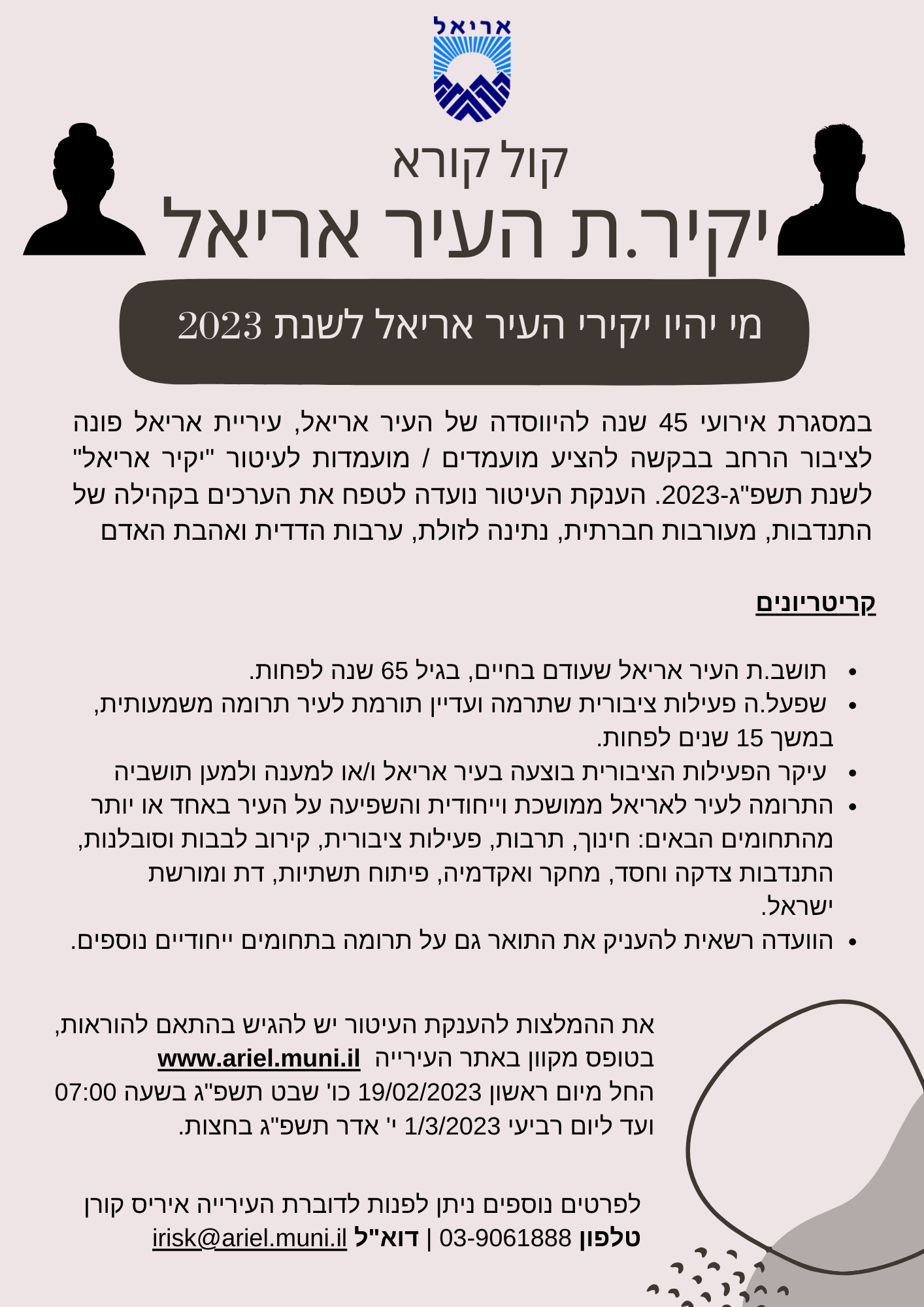 מי יהיה יקיר /יקירת העיר אריאל לשנת 2023