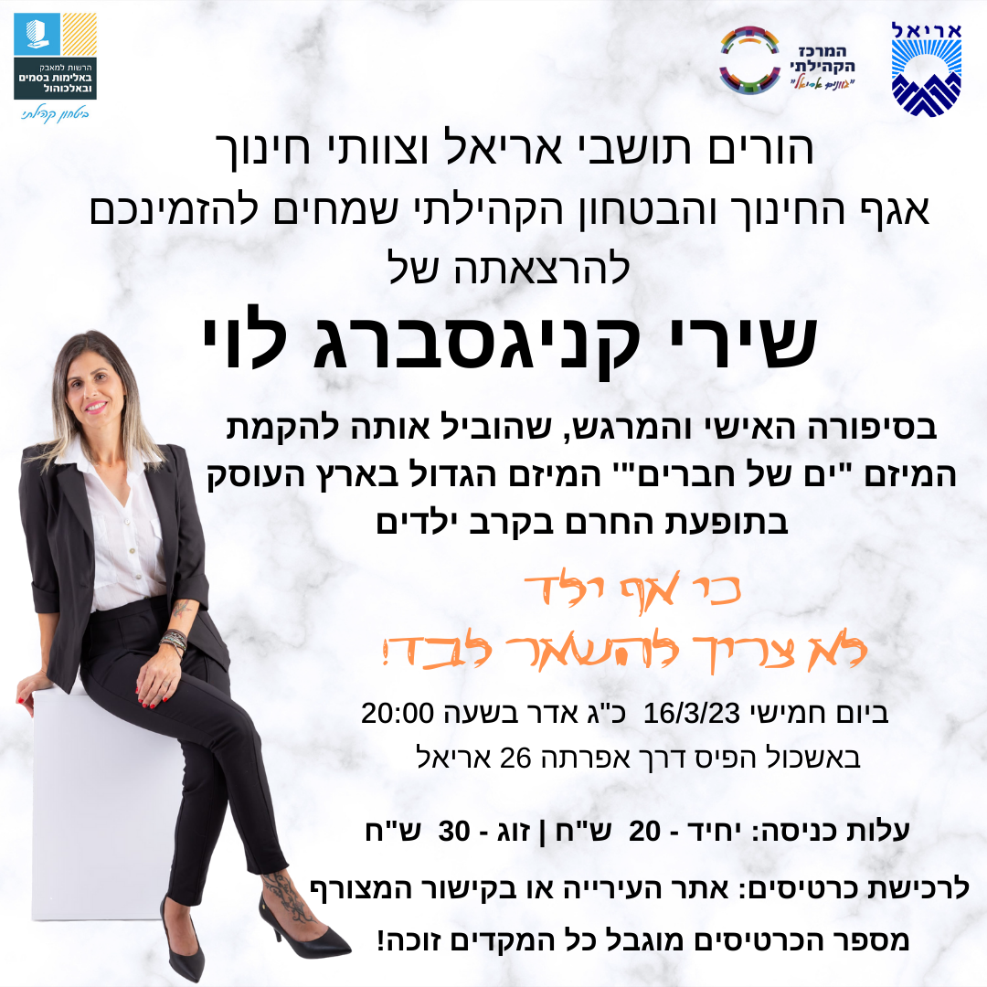אגף החינוך בשיתוף הרשות לבטחון קהילתי באריאל, מזמינים את אתכם להרצאה מצילת חיים - שירי לוי קניסברג האשה ששמה את נושא החרם על המפה ועשתה שינוי מהותי בחייהם של אלפי ילדים וילדות מגיעה לאריאל