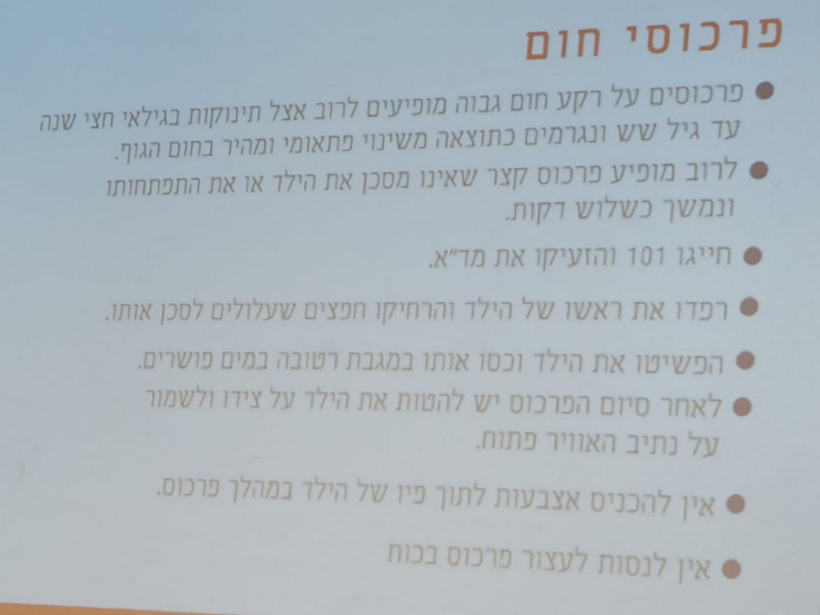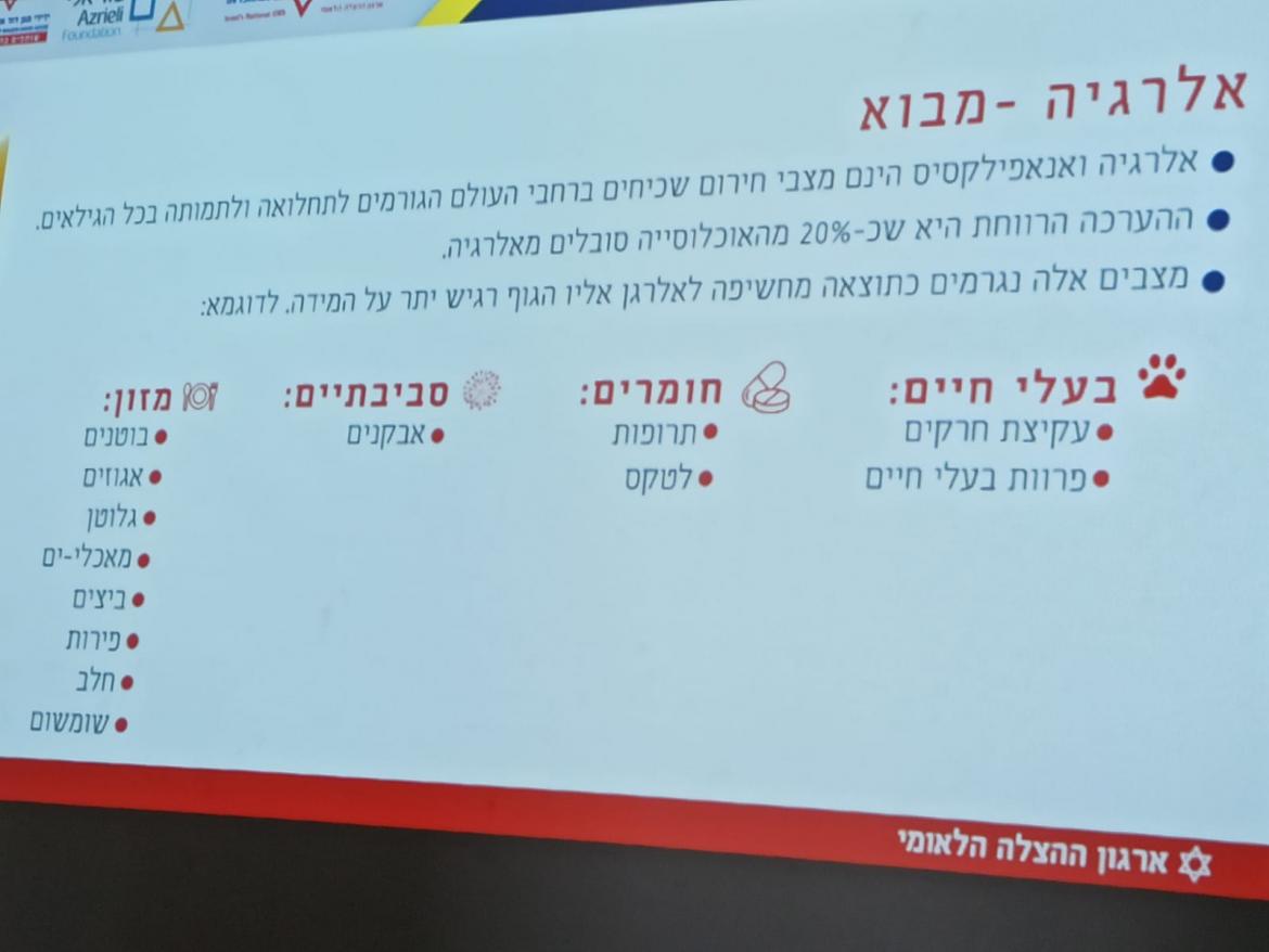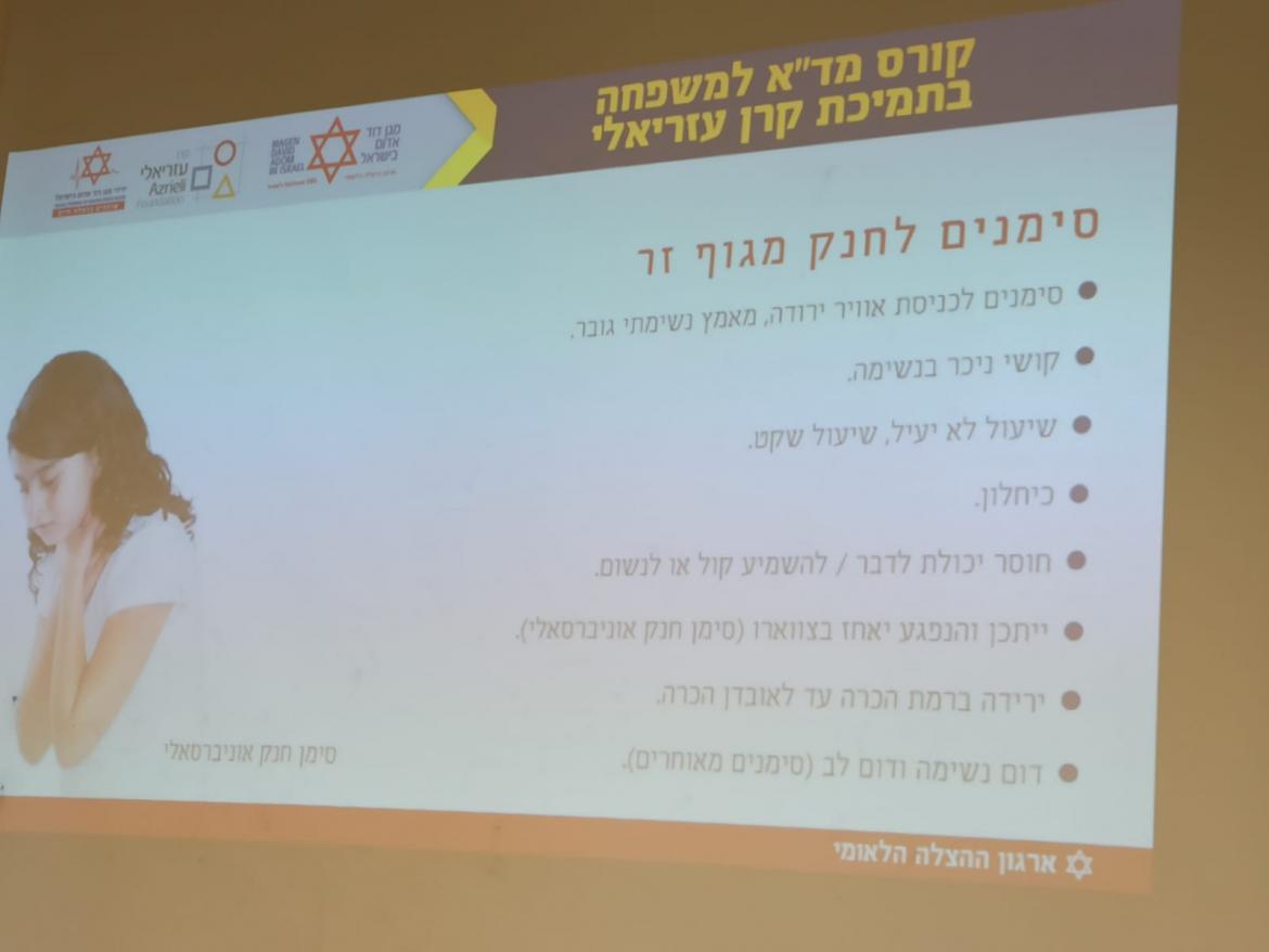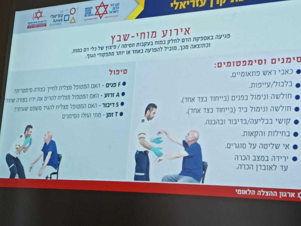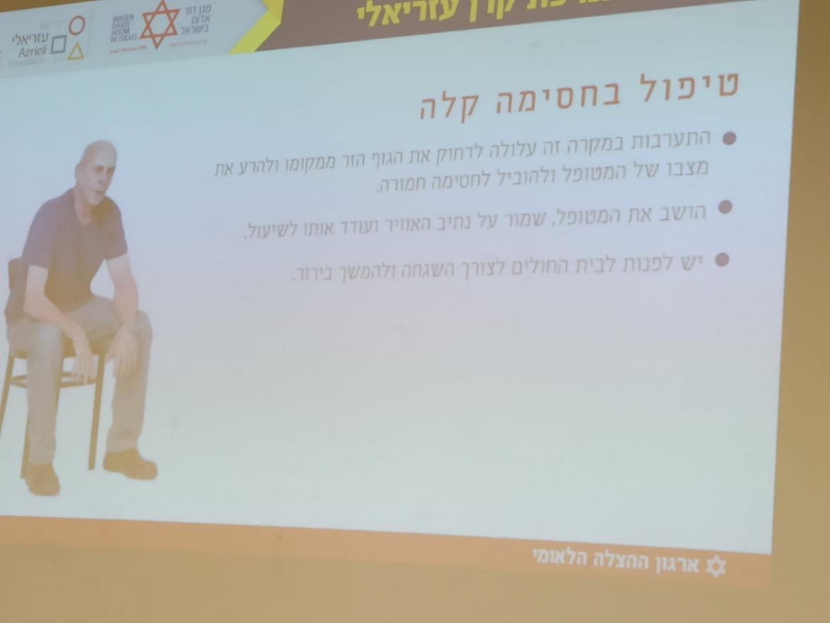 ההשתלמות עסקה בהתמודדות עם מצבים מסכני חיים בבית במרחב הציבורי במגוון נושאים כגון: עילפון, חנק, עצירת דימומים, הפעלת מפעם (דיפיבלירטור), אלרגיה, כוויות ועוד.