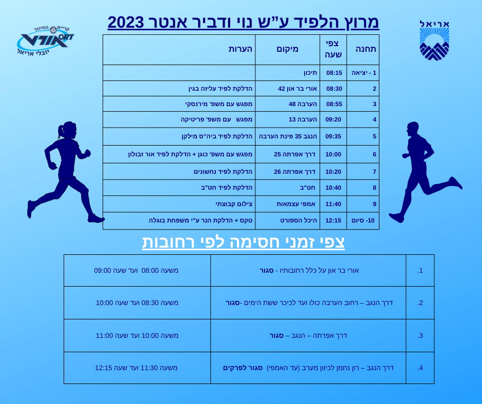 אנו מזמינים אתכם, תושבות ותושבים יקרים, לעודד את בני הנוער הרצים במחיאות כפיים והנפת דגלי ישראל לאורך המסלול בתחנות השונות.