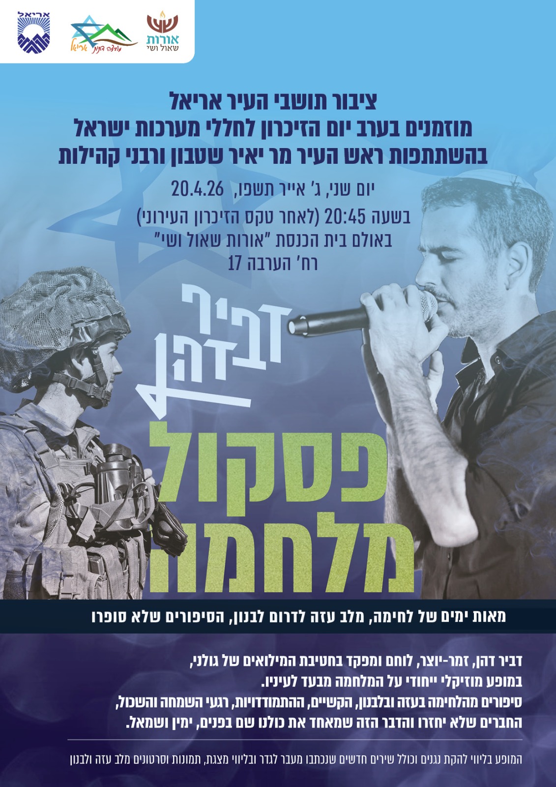 ציבור תושבי אריאל מוזמנים בערב יום הזיכרון לחללי מערכות ישראל ונפגעי פעולות האיבה לשמוע את הסיפורים מאת דביר דהן, לוחם ומפקד בחטיבת המילואים של גולני.