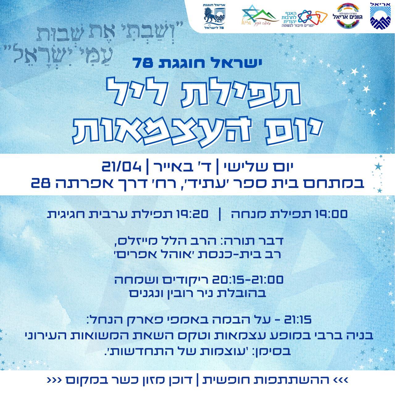 הציבור הרחב מוזמן לתפילה חגיגית בליל יום העצמאות ולאחריה ריקודים ושמחה.